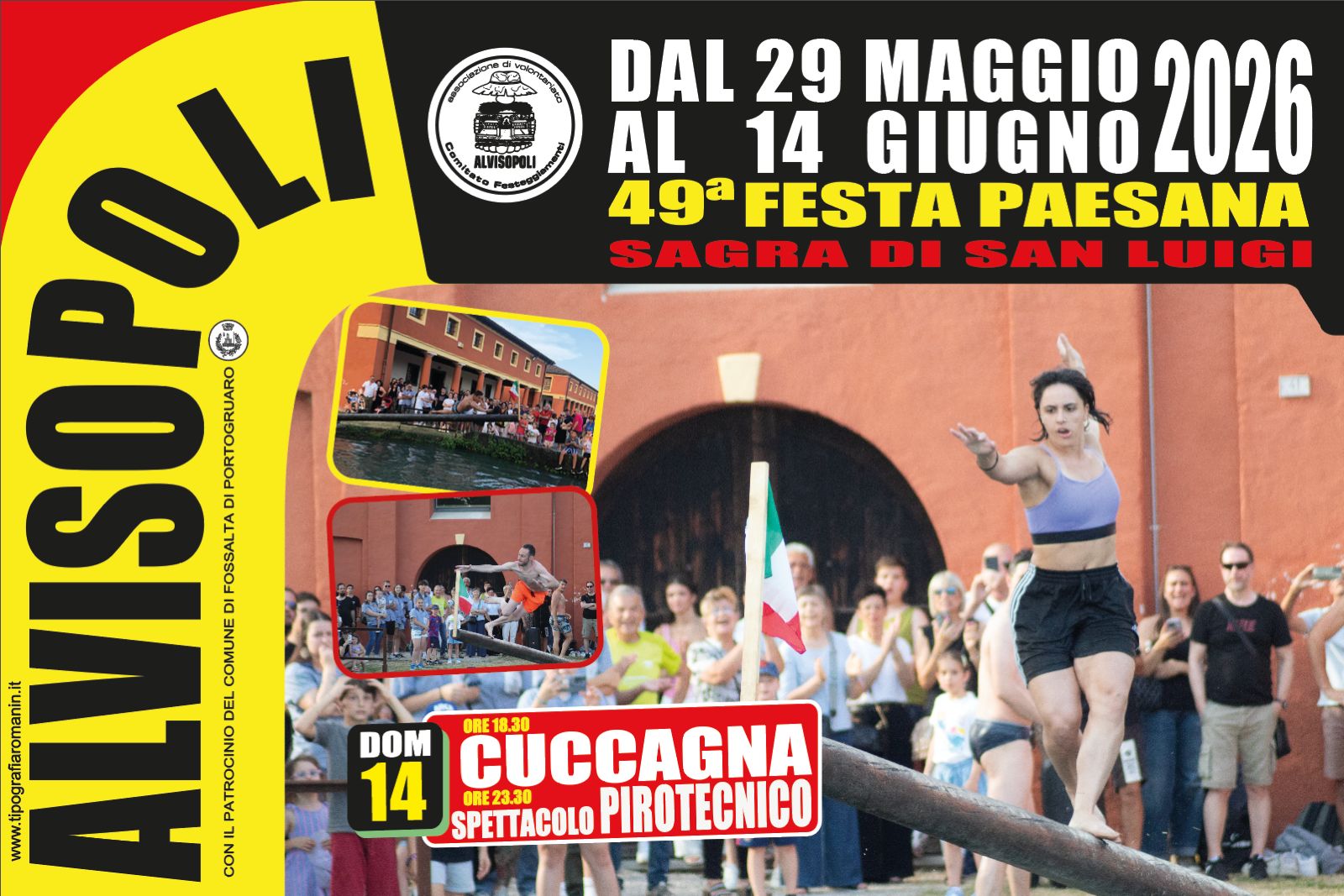 A rendere unica questa manifestazione è un appuntamento tanto atteso quanto spettacolare: la cuccagna orizzontale sul canale Taglio, una sfida goliardica e antica, che vede i partecipanti camminare – o scivolare – su un palo insaponato sospeso sull’acqua, tra risate e applausi. Questa tradizione popolare, ben più antica della sagra stessa, incarna lo spirito genuino di una comunità che sa divertirsi e accogliere.